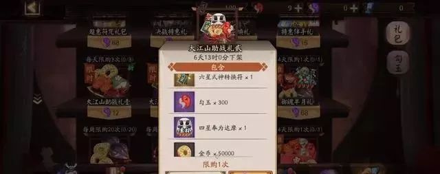 限购时间:10月23日维护后-10月29日23:59限购1次购买后获得:六星式神转换符×1(有效期180天),勾玉×300,四星奉为达摩×1,金币×50000【大江山助战礼叁】