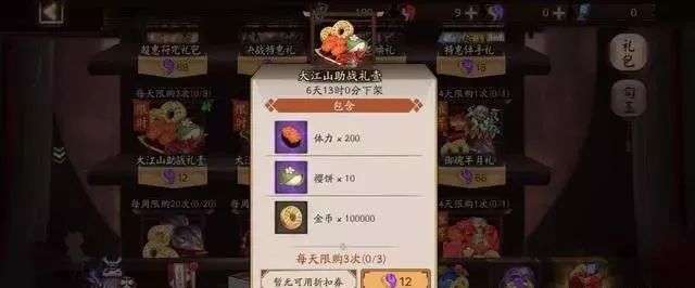 限购时间:10月23日维护后-10月29日23:59每日限购3次购买后获得:体力×200,樱饼×10,金币×100000 【大江山助战礼贰】
