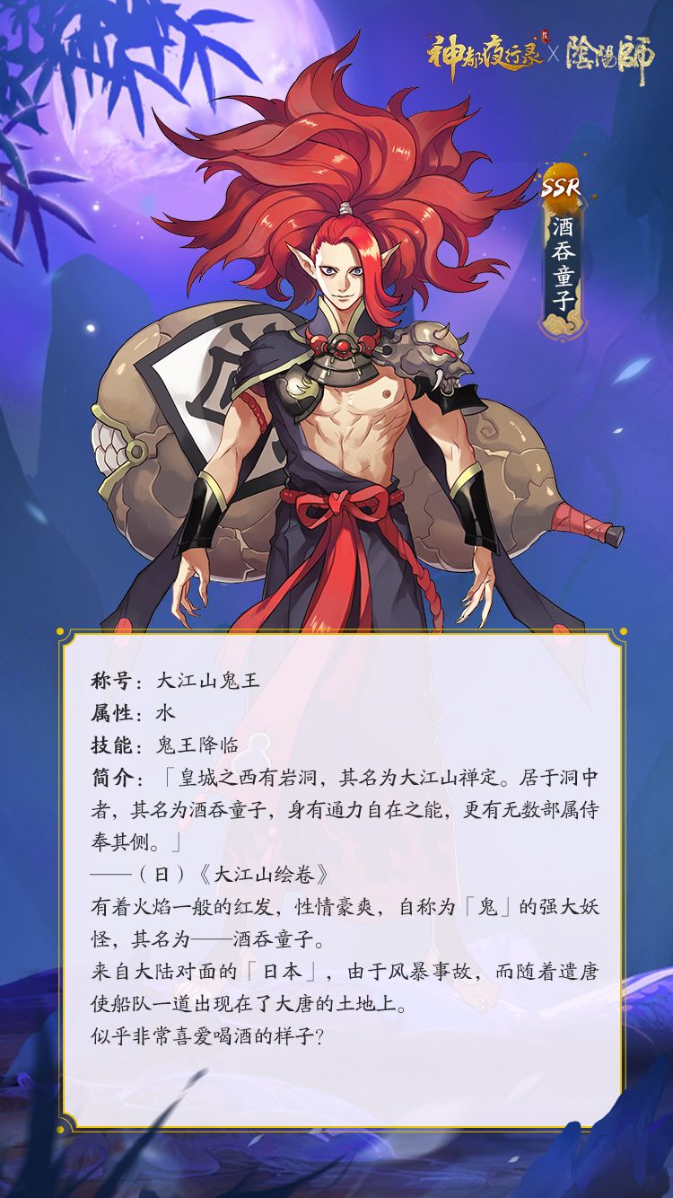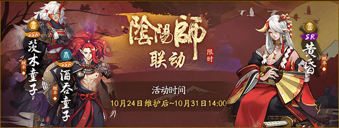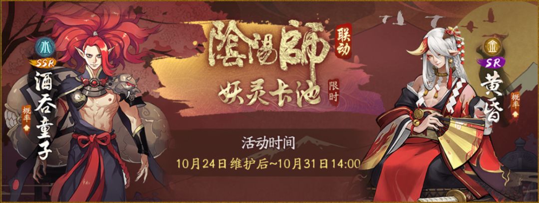 在10月24日更新维护后,限定SSR妖灵「酒吞童子」将加入「阴阳师联动」活动召唤池与「阴阳师联动」酒吞童子仅妖灵活动召唤池。