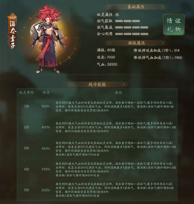 酒吞童子每受到8%最大气血的伤害或其他妖灵出阵,可增加一层狂气(最多同时存在10层)。出阵时恢复自身20%已损失气血,同时消耗最多4层狂气,每消耗1层狂气额外增加1段伤害,额外的每段伤害是常规1段的30%。