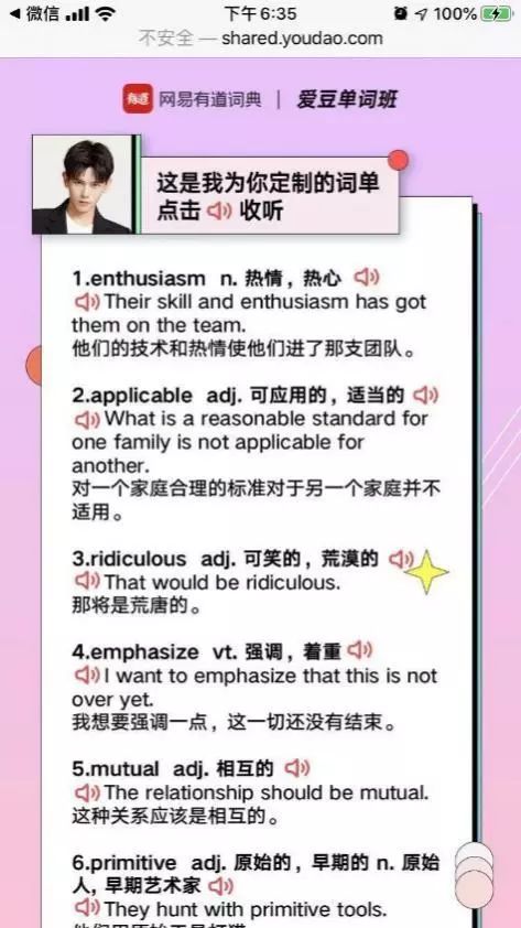 “爱豆单词班”采用H5的形式,亮点在于爱豆亲自录制部分单词或例句的朗读,粉丝学习完成之后可以获得爱豆定制版祝福,此外也有爱豆亲自录制的视频,鼓励大家多背单词。