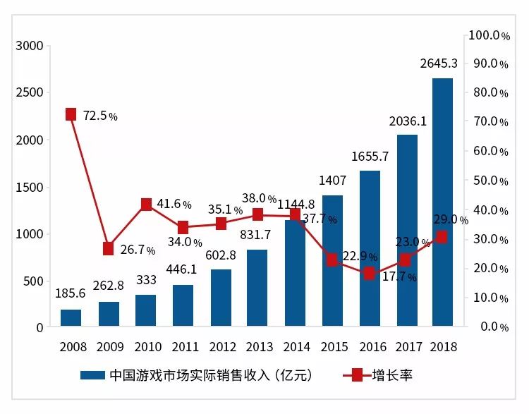 在2018年中国游戏产业收入总体达到2645.3亿元,