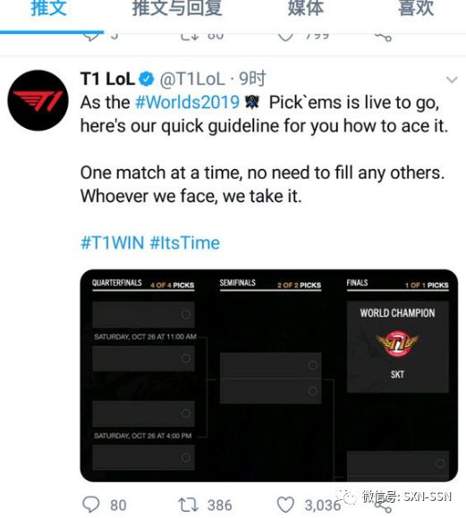 也许正是这样的巨大优势在握,SKT官推也是自信发出官推,并附上了一张SKT的晋级路线图,在这张图上,SKT已经走到了总决赛圈,并成功斩获S9总冠军