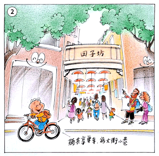 如何畅游上海?人小鬼大的三毛总结出了自己的“BMW”自由行攻略。三毛喜欢骑单车,上海街头随处可见的共享单车(BIKE)方便又快捷,可去田子坊闲逛、到滨江观景;三毛跟着地铁(METRO)去旅行,迪士尼乐园出站即达,一整天在乐园里玩到嗨;三毛还爱到处走(WALK),太平湖边走走停停,感受新天地的摩登交响,探寻石库门里的红色基因。“绿色出行,我的BMW最环保了!”三毛骄傲地说。