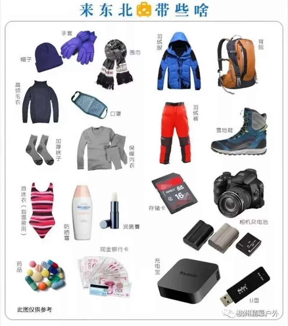 拉杆箱或者大背包,以及一个小背包(用于随身携带贵重物品)、保暖水壶饮用水1升、墨镜(阳光强,需防雪盲);各种电子产品,特别是相机需要2块电池(气温低耗电成倍增长);各种护肤品等