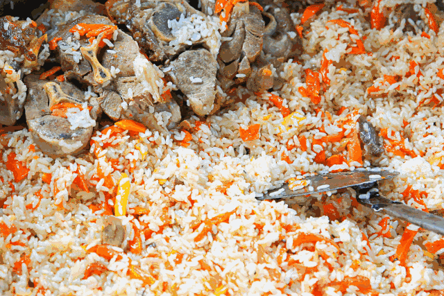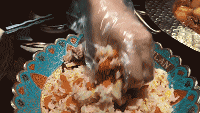 新疆特色的一道菜就是手抓饭,很多东西混在一起做成的,胡萝卜、米、羊肉、辣椒……