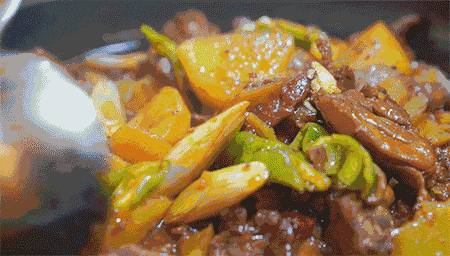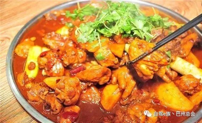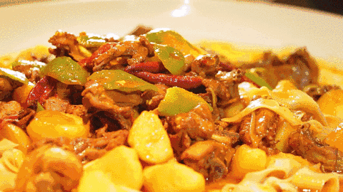是由一整只鸡和大量的土豆和辣椒做成的,放有新疆独有的各种香料,很有新疆本地特色。