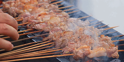 新疆把羊肉串当成主食,烤肉串往往是一块瘦肉和一块肥肉交替串成的。