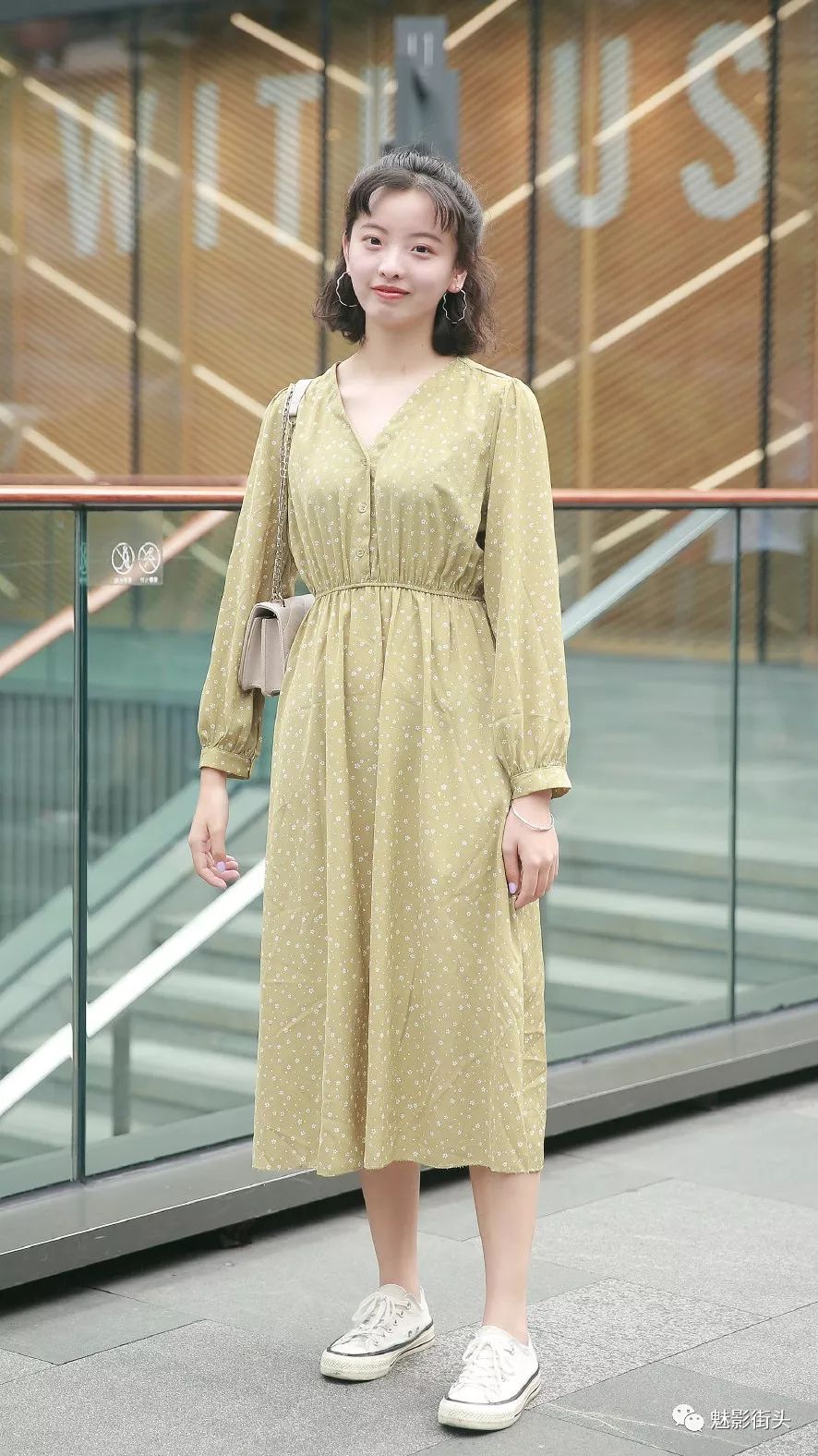 这个小姐姐选择了一款连衣裙,秋天的连衣裙很多女生都会选择长款的,长长的裙摆穿起来非常飘逸,而且还可以挡风御寒。这是一款杏黄色的连衣裙,裙身加上了白色印花设计,时尚大气的V领赋予了这款连衣裙更高的时尚度。小姐姐选择了一款白色帆布鞋来搭配连衣裙,用小白鞋来搭配连衣裙显得清新唯美,很有活力感。