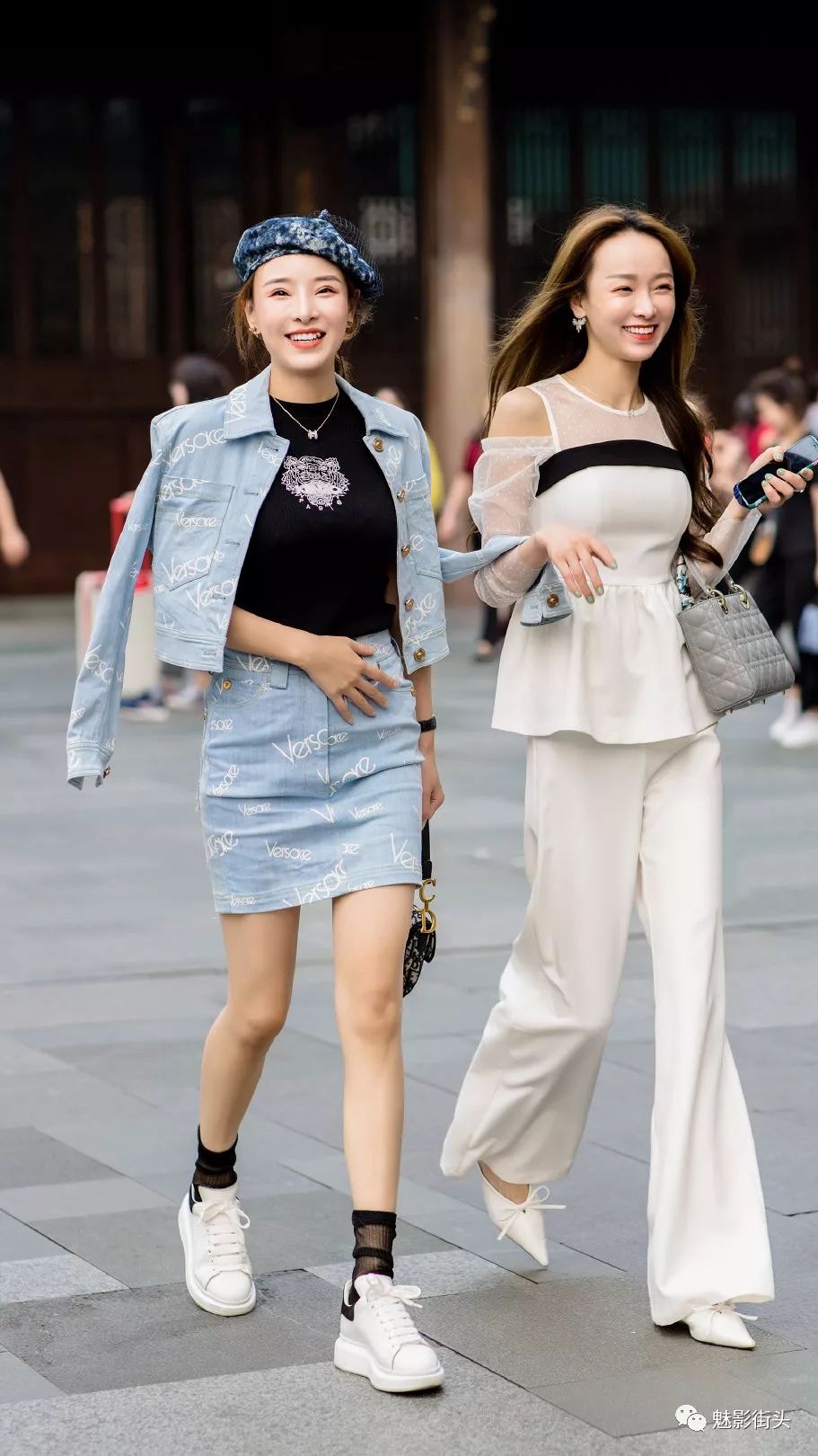 很多女生都喜欢约上闺蜜逛街,图片中左边这位美女,头上戴一顶牛仔面料的贝雷帽,上身穿一件高腰款式的牛仔外衣,衣服上印着大量的英文字母,既是商标又起到了装饰的作用,内搭一件黑色短袖针织衫,胸前印着一个老虎头像,特别威武。下身穿一条和牛仔衣配套的半身牛仔裙,搭配一双白色旅游鞋和一双黑色短袜,美女这一身牛仔装扮很有时尚格调,柔美的时尚气息中更加凸显了女生清纯可爱的一面。