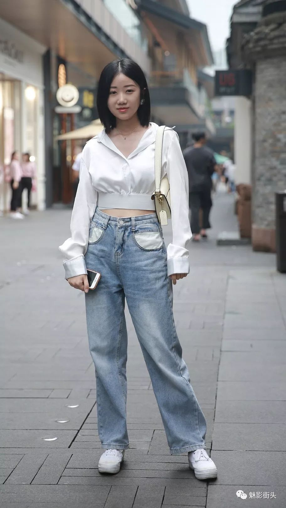 小白鞋是对白色鞋子的简称,小白鞋从去年一直流行到今年,热度依然不减。很多时髦的姑娘都喜欢用小白鞋搭配服饰,秋天这样穿清新唯美又时尚。这个小姐姐上身穿一件白色长袖衬衫,高腰款式加上束腰设计,修身效果非常好。下身穿一条蓝色直筒牛仔裤,搭配一双时髦的小白鞋,这个搭配非常简单,小女生清新唯美的气质扑面而来,时尚又好看。