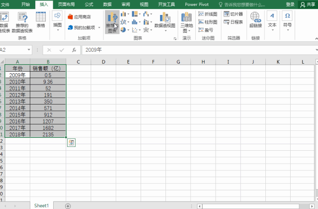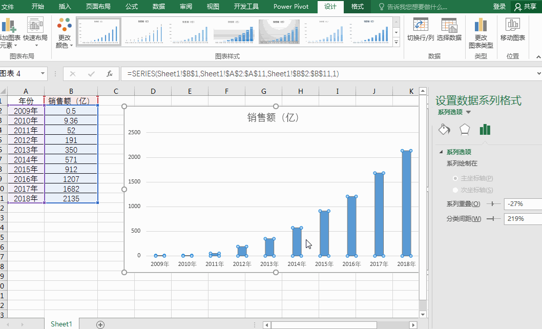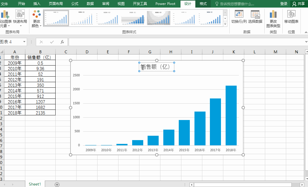 1、我们可以通过柱形图来展示历年淘宝的销售额,让销售额更直观表现出来。
