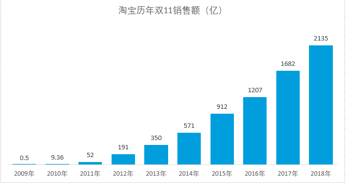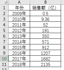 双11是淘宝的狂欢,也是中国人的狂欢,每年都在刷新新的记录。今天制作一个淘宝历年双11销售额图表。