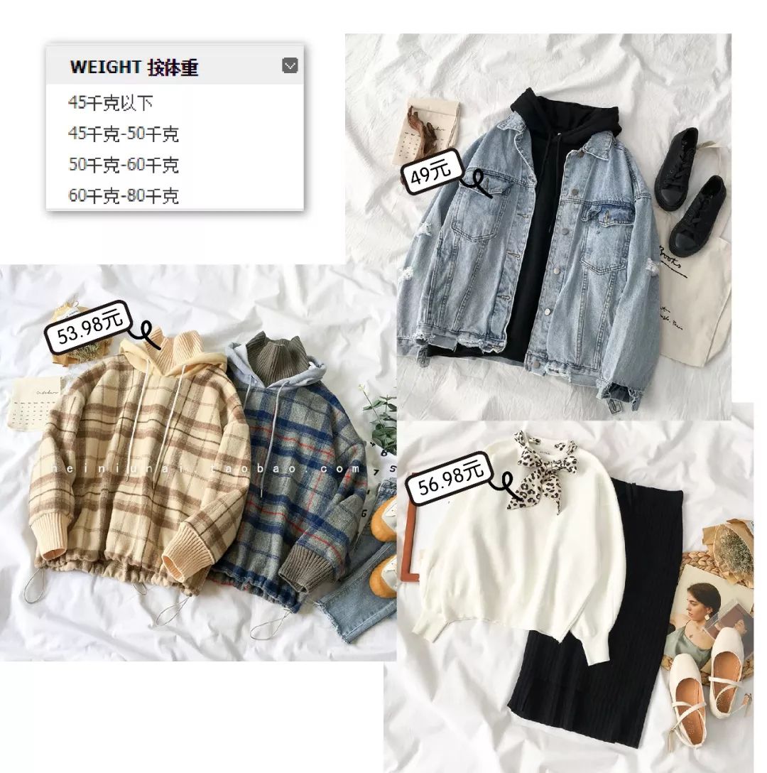 都是平铺图,一般这样的店呢量好自己的肩宽、胸围、腰围、臀围然后对照店家给的尺码基本上不怎么踩雷了而且店家很贴心的在分类里有一个按体重搜索照顾到很多身材的姐妹啦~
