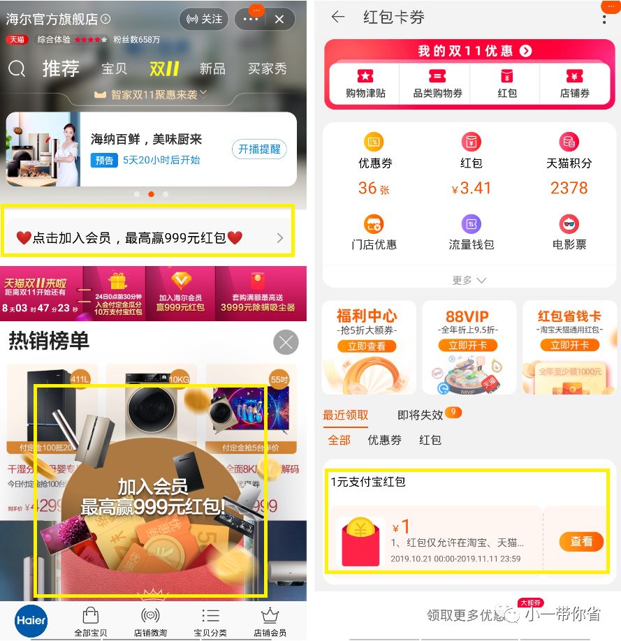 淘宝搜索“海尔官方旗舰店”,点框选处入会后,在我的淘宝-红包卡券里可以看到