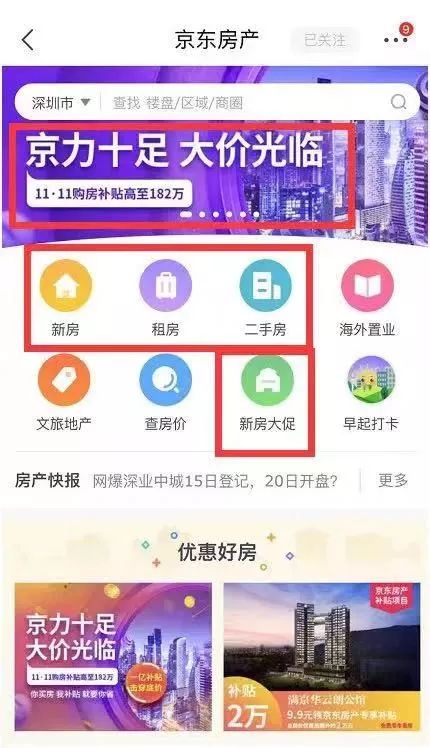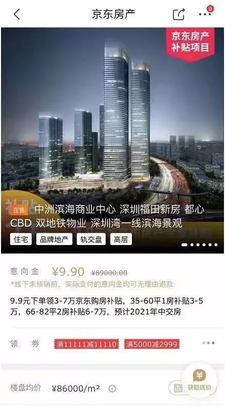 基金君打开深圳福田一新房,显示为“京东房产补贴项目”,只需9.9元下单即可领取3-7万京东购房补贴。此外,还有满11111减11110等优惠券。