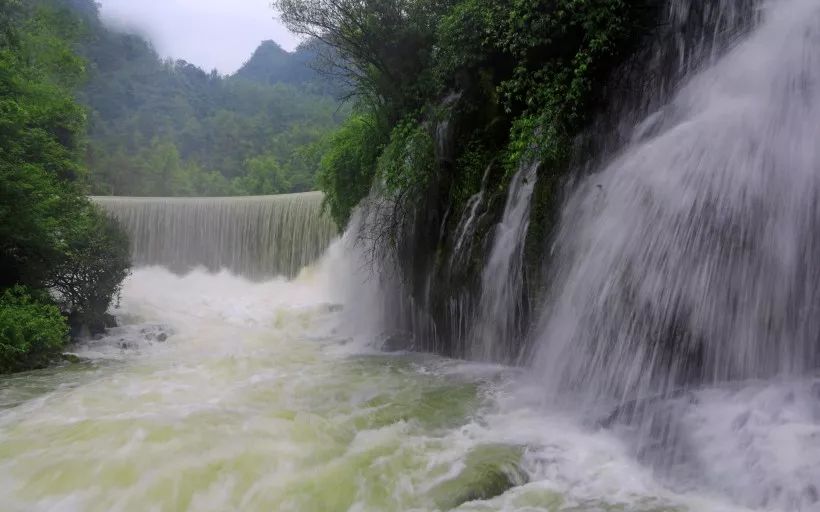 穿过水上森林便来到了卧龙潭瀑布,瀑布就像在两山之间竖起了一道珍珠的屏,细细的瀑布像一条条银链,又像一粒粒断线的珍珠,和着缕缕青烟,奔流而下,滚滚而去!