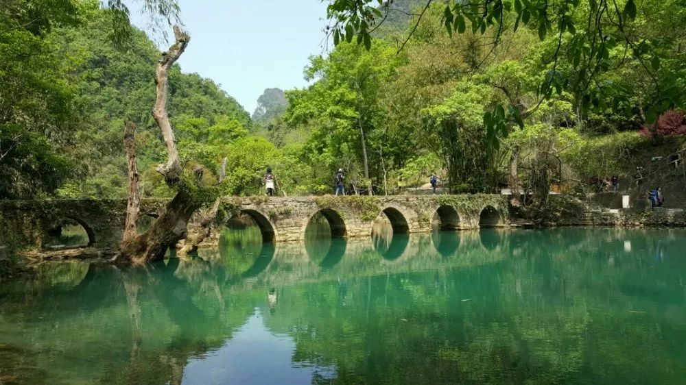 古桥身上爬满了绿色的藤蔓,与两岸的青山交相辉映。站在古桥上,俯视着桥下的涵碧潭,潭面水平如镜,潭水犹如一块碧绿的翡翠,微风吹过,漾起层层波纹。那环绕的山峰,参天的树木倒映潭中,犹如一幅碧绿的山水画。