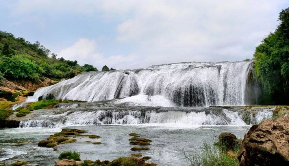 陡坡塘瀑布位于黄果树瀑布上游1公里处,瀑顶宽105米,高21米,是黄果树瀑布群中瀑顶最宽的瀑布。每当洪水到来之前,瀑布都要发出“轰隆、轰隆”的吼声,因此又叫“吼瀑”。