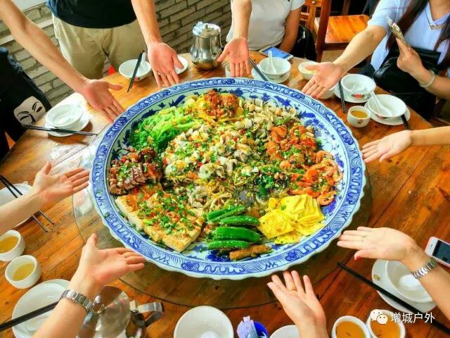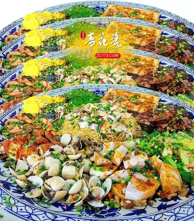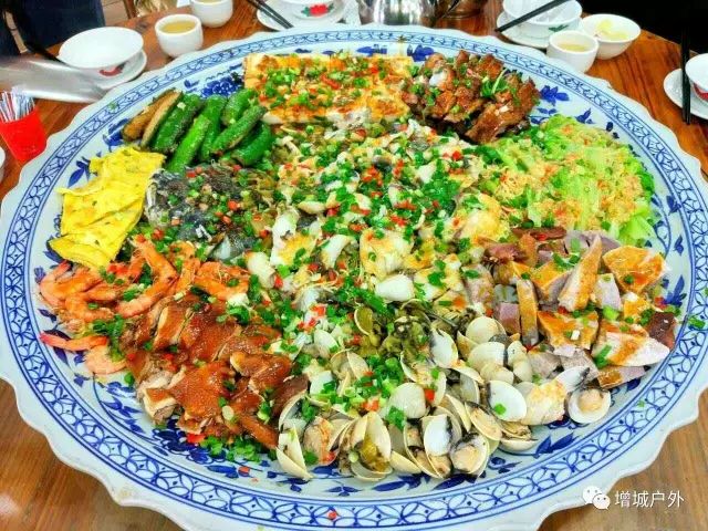 11:30 前往品尝 青花瓷大盘鱼,午餐可是本趟旅行的“戏胆”了,在这里大 吃大喝了。(费用已含)我 们为大家准备了当地特色大盆菜,大盆菜是一道广东省的汉族传统名菜,属于粤菜系。起源于南宋末年,细吃有先后,细持有讲究,既经济又方便,好友共聚餐既简 单又快捷。现今几已成为香港饮食文化的标志。制作盆菜的材料相当丰富,古代所用的材料最少有八样,包括萝卜、枝竹、鱿鱼、猪皮、冬菇、炆鸡、鱼球和猪肉。