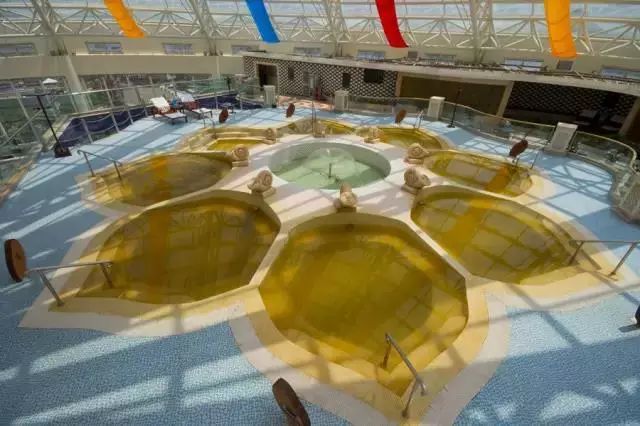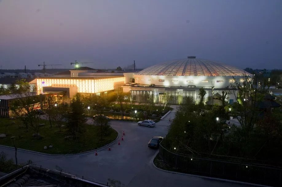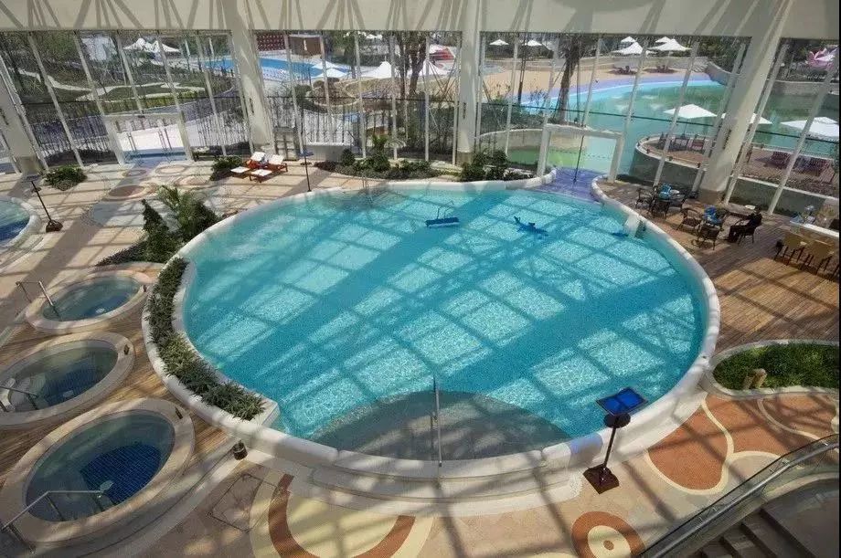 主体建筑像一艘UFO降落在此地,圆形的穹顶,直径达到60米,在这样大的一个空间里,设置了水疗设施,可以容纳多达1800人同时享受。进入大厅,引导,取牌,更 衣,都有细心的提示。换好泳衣,冲凉后,便进入主体建筑的中心仰头往上看江南花雨伞装点着穹顶,穹顶中心巨大的空调鼓风机带走室内温泉的湿闷,同时保持了室内的恒温。