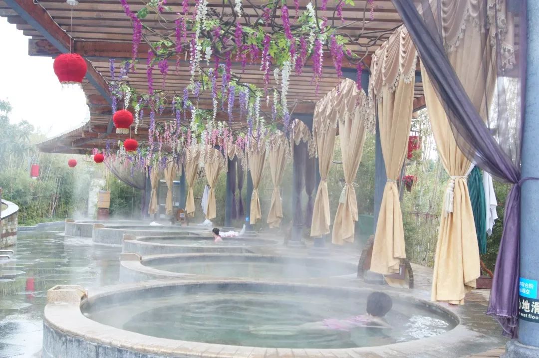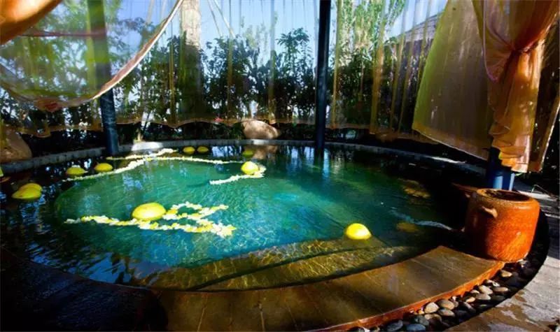 50多个特色温泉池散落在花草树木之间,含有中药保健浴、瓜果饮品浴、花卉灵草浴、原味汤池浴及私密园林情侣浴,亲亲鱼池和石板浴等特色项目。水雾氤氲,疑是仙境,泉涌自然,灵气逼人;在天地眷顾的地方,沐汤修德,放逐身心。