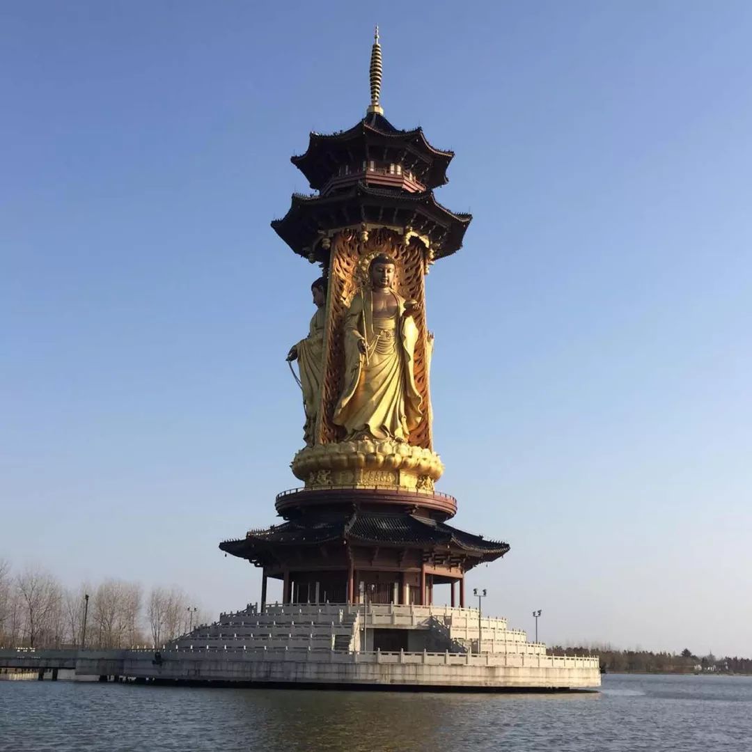 湖中我们还能看到世界上最高的水上三面药师佛塔,佛塔与碧水蓝天相映成彰。