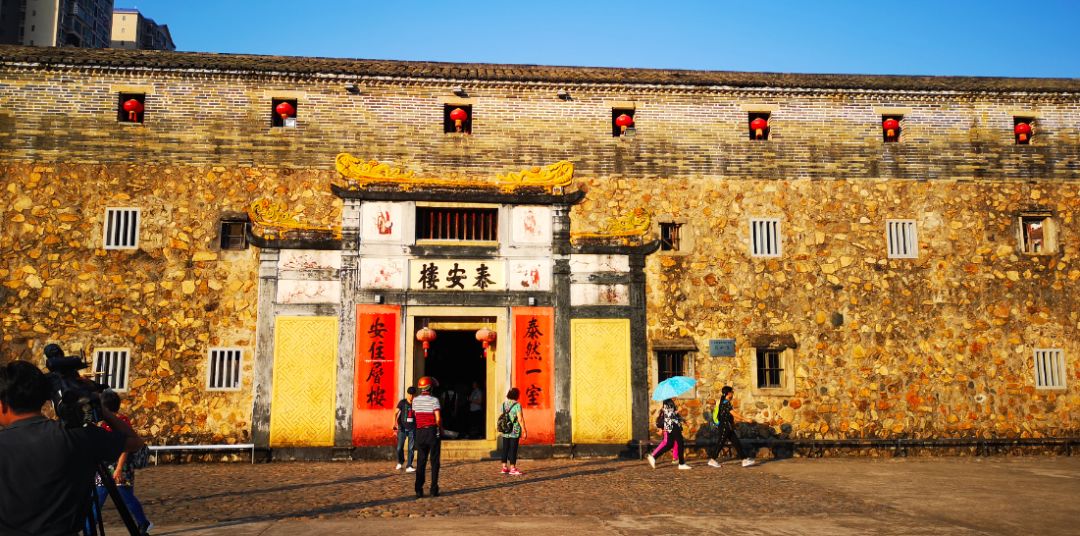 之后到大埔参观泰安楼,泰安楼是当地典型的围龙屋。泰安楼的大门非常独特,初看是一座雄伟的门楼,仔细一看,这门楼原来是镶嵌在墙上的,这是一大特点。泰安楼名字寓意为“国泰民安”,建于清朝乾隆年间。目前,泰安楼里还有几户人家在居住。