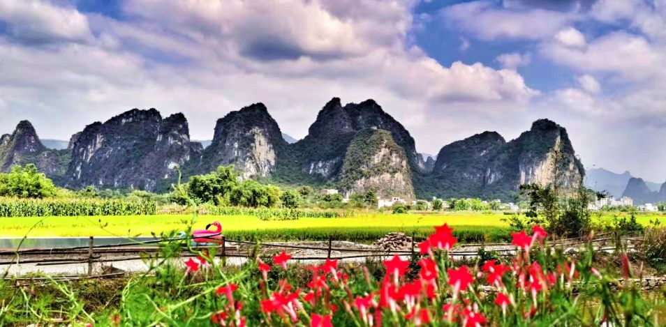 徒步之旅最高潮部分,则是走入九龙小镇时,映入眼帘的那连片的花海,被无数起伏的秀山围绕,景色特别壮丽,好像置身在巨大的天然盆景画中。