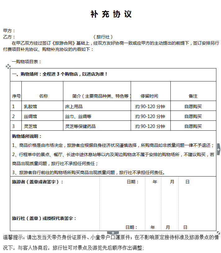 在甲乙双方经过签订《旅游合同》基础上,经双方友好协商一致或应甲方的主动提出的前提下,签订安排另行付费项目补充协议、购物补充协议的内容如下: