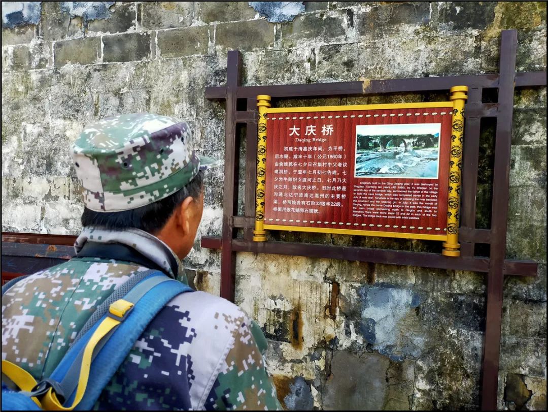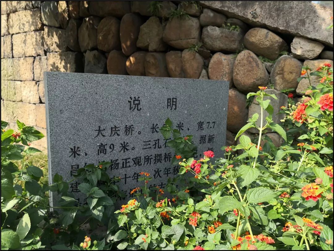 原来在研究那座古桥,名叫大庆桥,看来是解放所建的大桥了吧。再细看说明,才知道是清朝年间所建,取名为大庆,意味着喜庆的意思,而并不是工业学大庆时的建筑物啊。秋哥在好好的学习上面的文字呢,这照片应该是阿西他们所拍的吧。