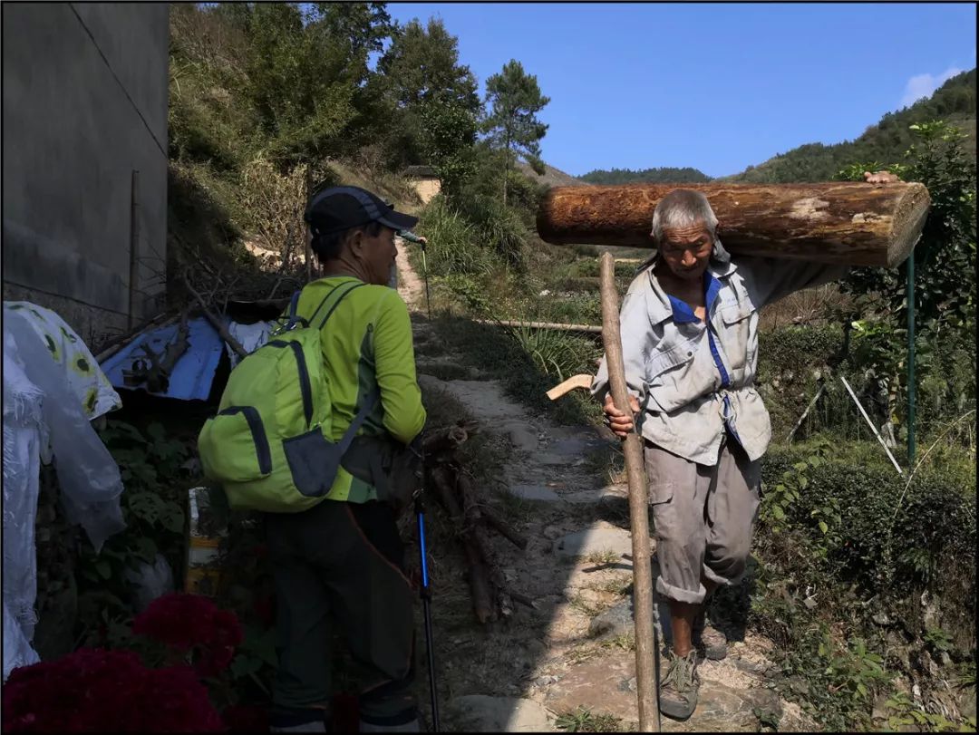 路过一个地方休息片刻,喝点水,吃吃水果,看见一个老者,背着百来斤重的树段下山来了。