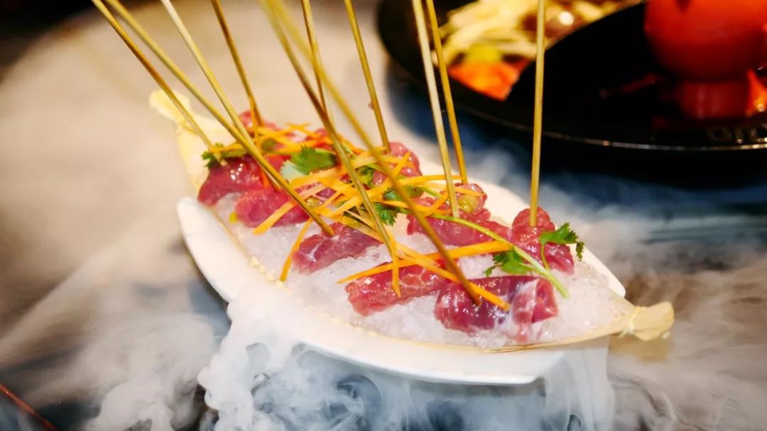 鲜红色的牛肉,选取优质肉品 肥瘦比例完美,鲜活的大虾配上大厨特制的牛肉卷无处不呼应这道菜霸气的名字