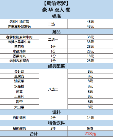 1、原价218元的豪华双人餐仅需68元2、100元代金券限时抢购(锅底菜品可用、酒水饮料除外)详情点击文末
