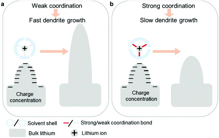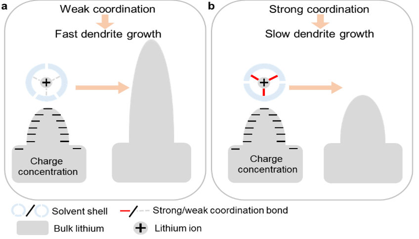 图 1. 不同配位作用强度的电解液中锂枝晶生长示意图:(a) 弱配位作用利于锂枝晶快速生长;(b) 强配位作用阻碍锂枝晶生长。