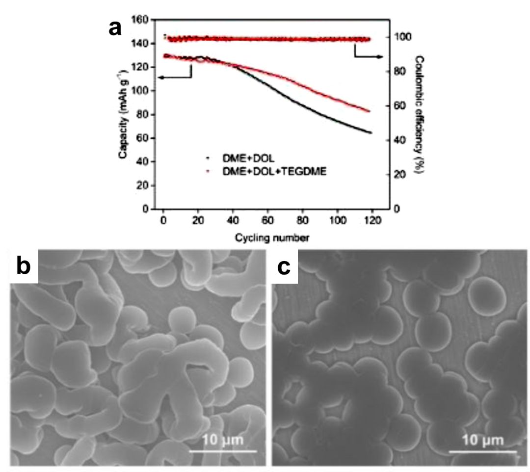 图 2. 两种锂金属电池的充放电循环稳定性:(a) 含 TEGDME 与无 TEGDME 电解液。(b) 无 TEGDME 电解液与 (c) 含 TEGDME 电解液的锂金属负极在充电后的表面形貌。