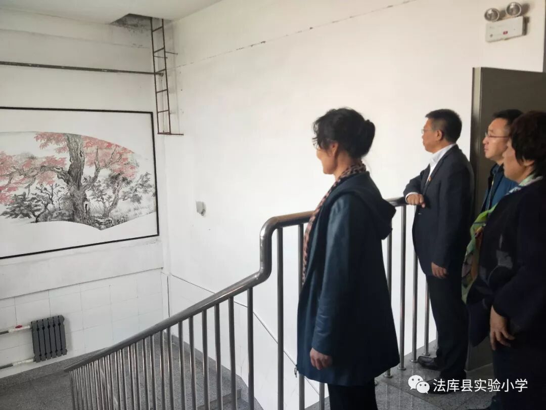 接下来,在小讲解员的带领下,领导们调研了学校的文化建设。走廊中,一幅幅师生的山水画《细雨生烟》、《小桥流水》、《望海寺一景》、《桃花掩映白鹤楼》、《岁岁白鹤飞》……熠熠生辉;幅幅书法作品:《上善若水》、《仿兰亭序》等等古朴典雅;还有《龙山秋色》、《东湖晨曲》和《万里江山》由美术教师亲手绘制的墙壁山水画等,更显大气磅礴!这样的装点,不仅让学校的角角落落翰墨飘香,也体现了我们的山水画和书法教学工作已经开花结果,更得到了在场领导的一致好评。