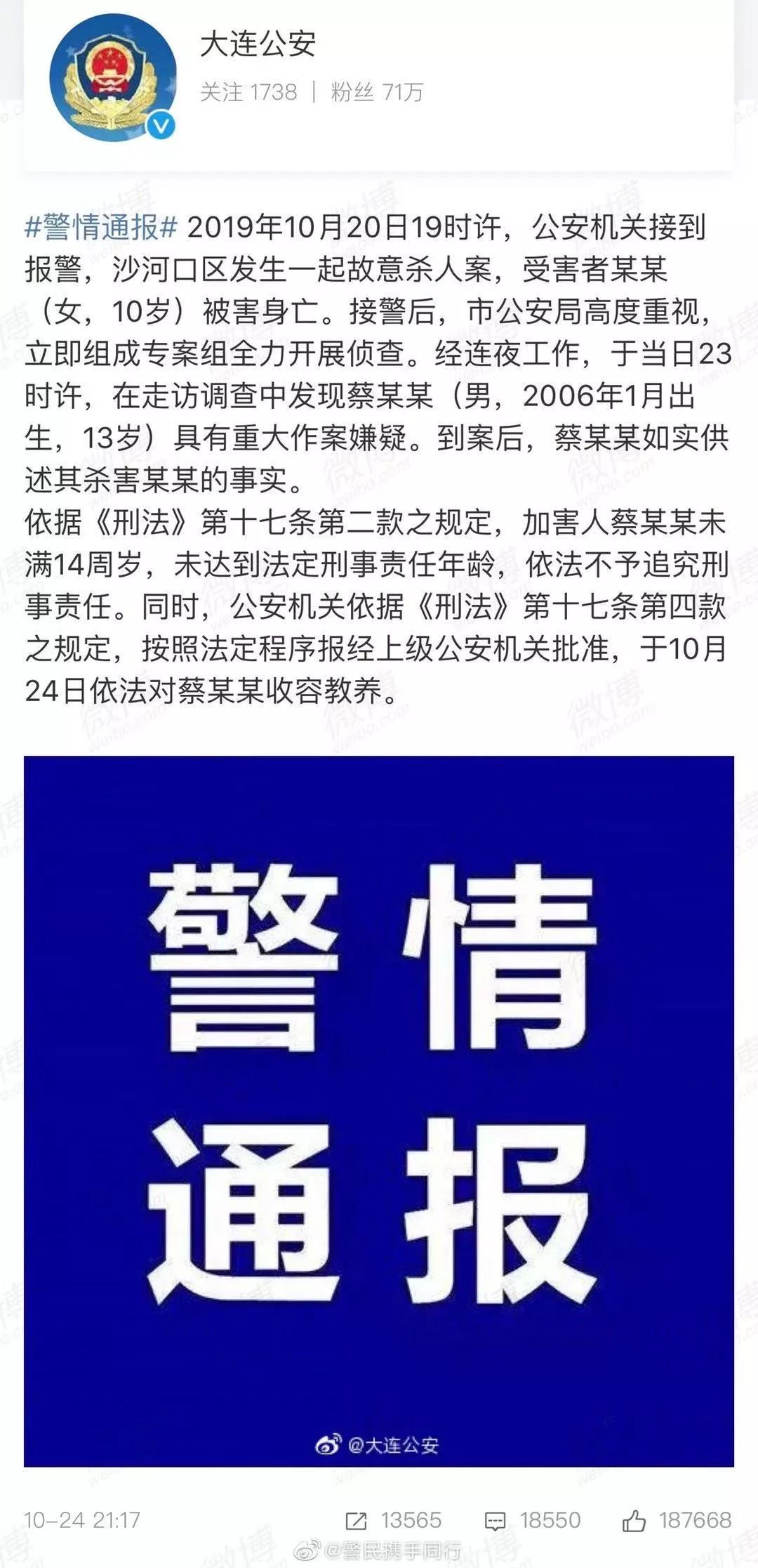 据大连市公安局10月24日晚间通报,称 2019年10月20日19时许,公安机关接到报警,沙河口区发生一起故意杀人案,受害者某某(女,10岁)被害身亡。接警后,市公安局高度重视,立即组成专案组全力开展侦查。经连夜工作,于当日23时许,在走访调查中发现蔡某某(男,2006年1月出生,13岁)具有重大作案嫌疑。到案后,蔡某某如实供述其杀害某某的事实。