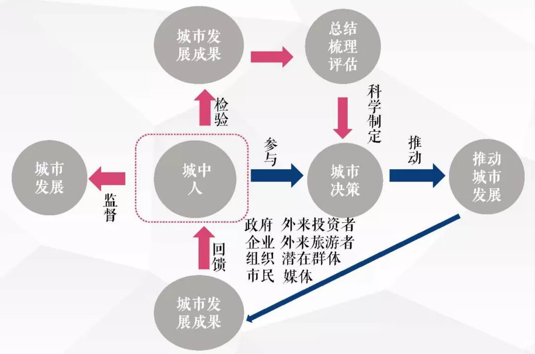 观点: 城中的人并不是狭隘的原著居民,而是包含政府、企业、组织、市民、外来投资者、外来旅游者、潜在群体、媒体等的广义的城中人。良好的城市与城中人的关系,应为城中人通过自身体验,总结梳理评估城市发展的优势和不足,积极参与城市决策,监督并推动城市发展,最终共享城市发展。