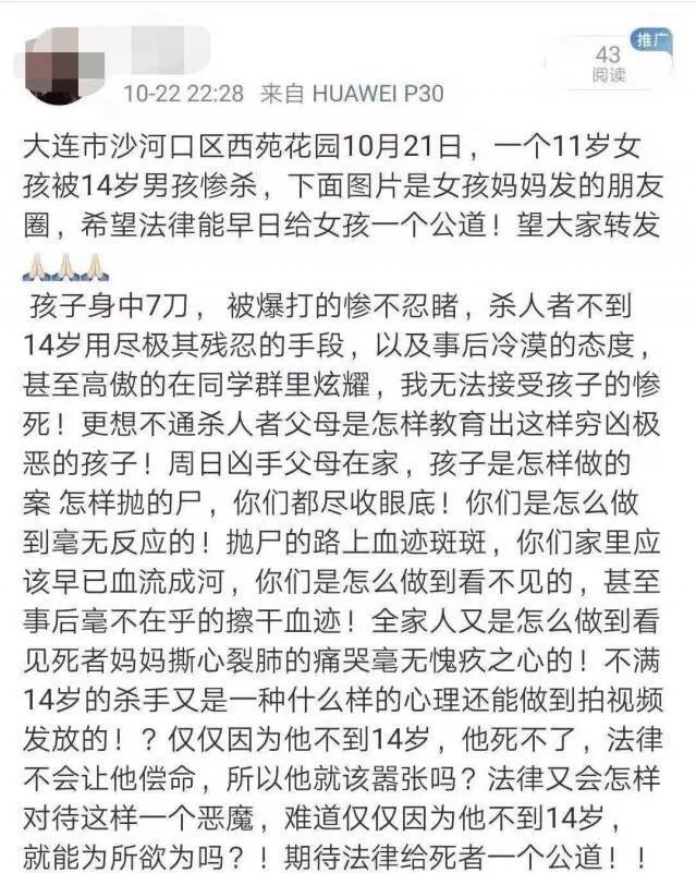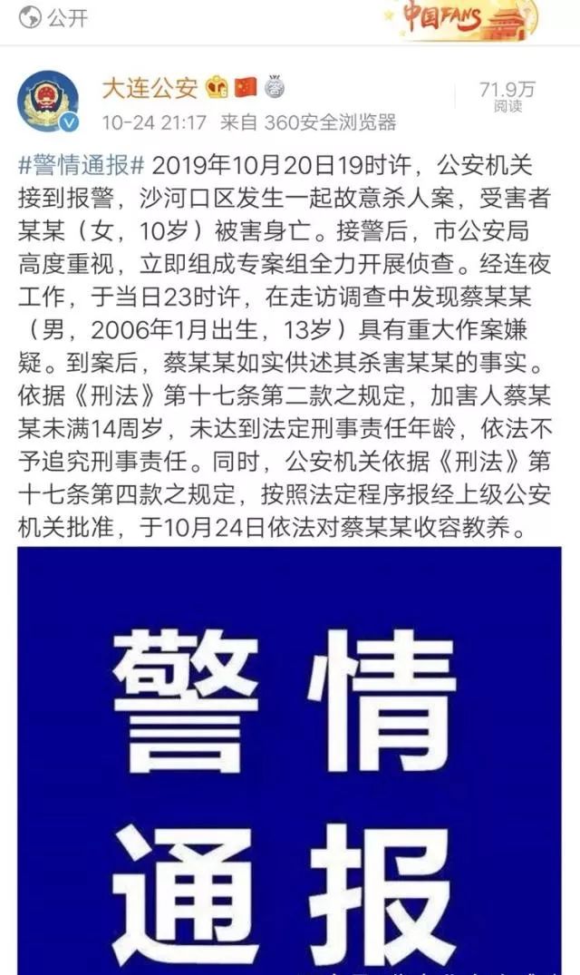 【大连11岁女孩被杀害】10月20日,大连市沙河口区一名11岁女孩被一名14岁男孩杀害,女孩身中7刀。