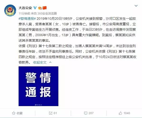 据@大连公安消息:2019年10月20日19时许,公安机关接到报警,沙河口区发生一起故意杀人案,受害者某某(女,10岁)被害身亡。