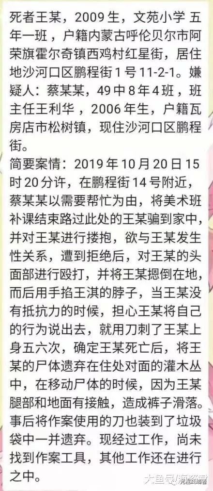10月20日是周日,大连10岁的女孩淇淇参加完美术班补课回家,在路上她遇到了初中二年级学生蔡某某。14岁的蔡某某表示需要帮忙,将乐于助人的淇淇骗到家中。进入家门后,蔡某某对淇淇进行搂抱,并欲和琪琪发生性关系,遭到年仅10岁的淇淇拒绝。