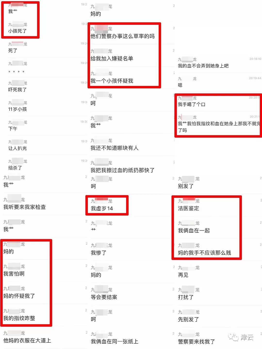 在这份聊天记录中,蔡某某于当日19:30左右在班级群发了一条从自家窗户拍摄的搜查现场视频,并对同学说:“小孩死了,让人扒光给杀了,就在我家门口对面。”20点左右,他继续写道:“他们警察办事这么草率的吗,给我加入嫌疑名单,我一个小孩怀疑我,我把我擦过血的纸扔那块了,我的血不会弄到她身上吧?我怕我的指纹和血在她身上,那我不就完了吗?”等内容。