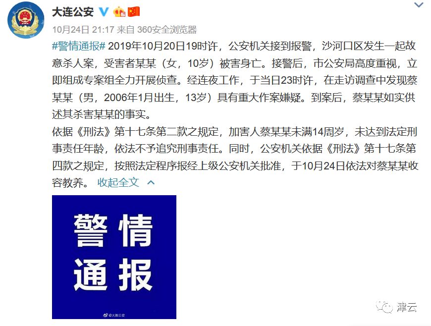 2019年10月20日19时许,公安机关接到报警,沙河口区发生一起故意杀人案,受害者某某(女,10岁)被害身亡。接警后,市公安局高度重视,立即组成专案组全力开展侦查。经连夜工作,于当日23时许,在走访调查中发现蔡某某(男,2006年1月出生,13岁)具有重大作案嫌疑。到案后,蔡某某如实供述其杀害某某的事实。