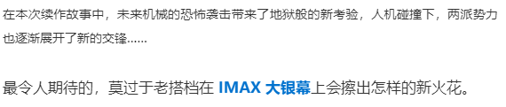 与全新升级新型反派终结者REV-9的人机大战,也将在 IMAX 激光校准的强大音响系统加持下全面升级,人类的血肉之躯和机器人的钢铁骨骼相互碰撞,IMAX音效呈现强势穿耳,震颤人心!