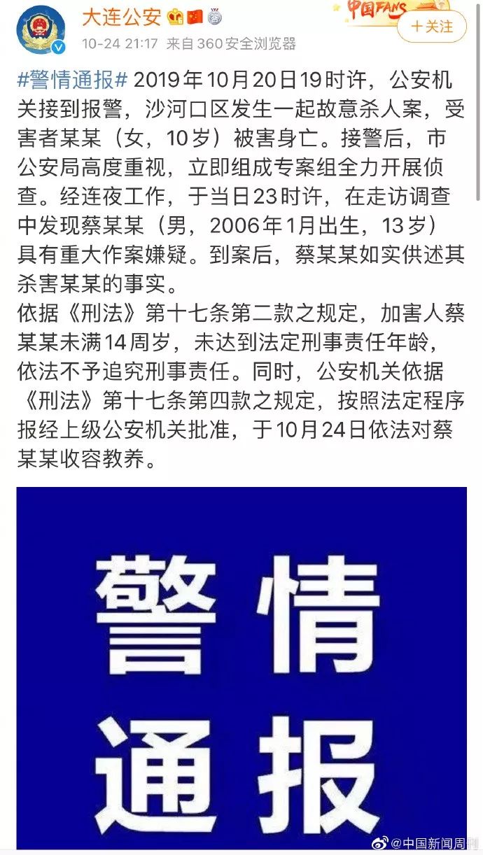 10月24日晚9时30分,大连市公安局官方微博发布通告表示,2019年10月20日19时许,公安机关接到报警,沙河口区发生一起故意杀人案,受害者某某(女,10岁)被害身亡。接警后,市公安局高度重视,立即组成专案组全力开展侦查。经连夜工作,于当日23时许,在走访调查中发现蔡某某(男,2006年1月出生,13岁)具有重大作案嫌疑。到案后,蔡某某如实供述其杀害某某的事实。