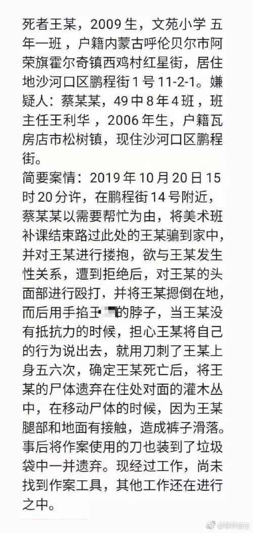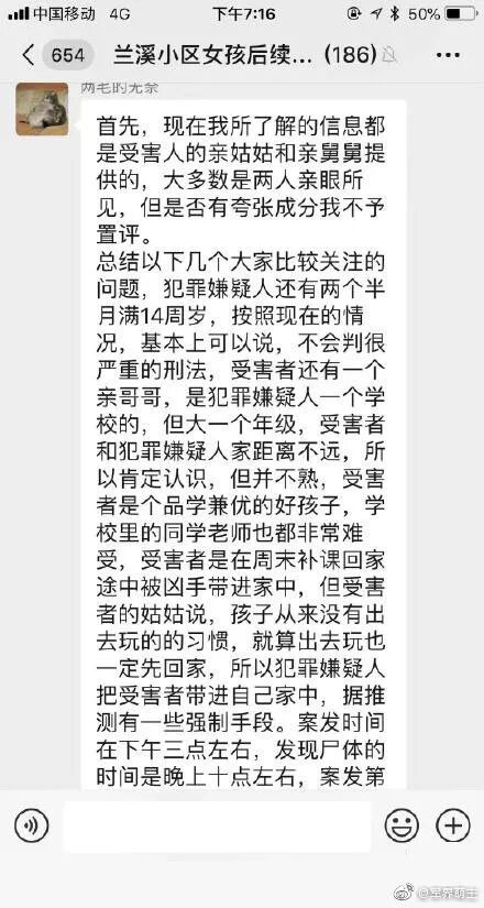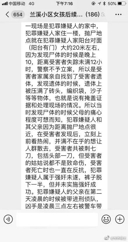 以下是来自微博的截图。截图爆料了很多内容!惨案发生在周末,“凶手”以自己需要帮助为由,将女孩约到家中,企图强奸,女孩反抗,在不反抗之后,“凶手”担心女孩把事情说出去,将女孩杀害,弃尸灌木丛!