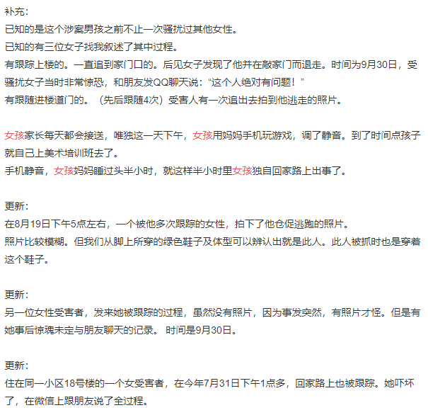 事情扩散后,有多名女士陆续自爆孩子曾遭到不同程度的尾随骚扰