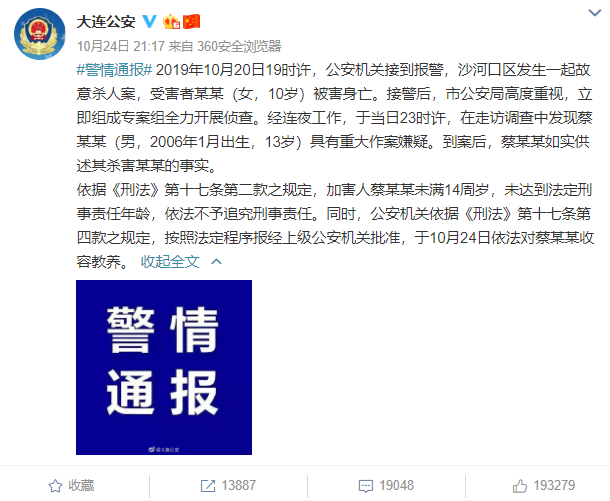 @大连公安 2019年10月20日19时许,公安机关接到报警。依据《刑法》第十七条第二款之规定,加害人蔡某某未满14周岁,未达到法定刑事责任年龄,依法不予追究刑事责任。于10月24日依法对蔡某某收容教养。