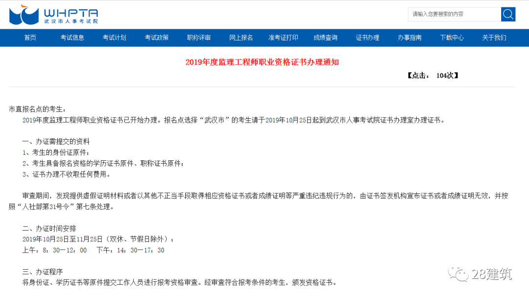 武汉市直报名点的考生:2019年度监理工程师职业资格证书已开始领取。报名点选择“武汉市”的考生请于2019年10月25日起到武汉市人事考试院证书领取室领取证书。
